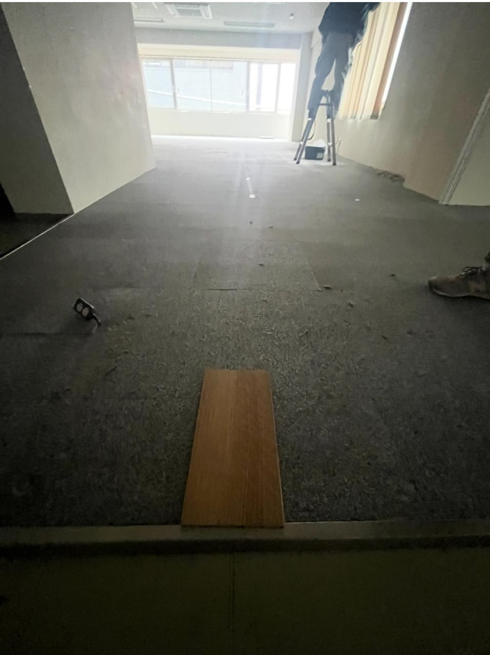 数十年借りられていた会社が移転のため退去されての原状回復工事タイルカーペットを木目調のフロアタイルに張り替え予定。天井・壁も全て白塗装予定