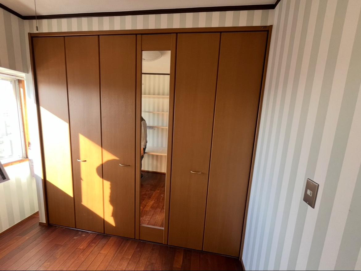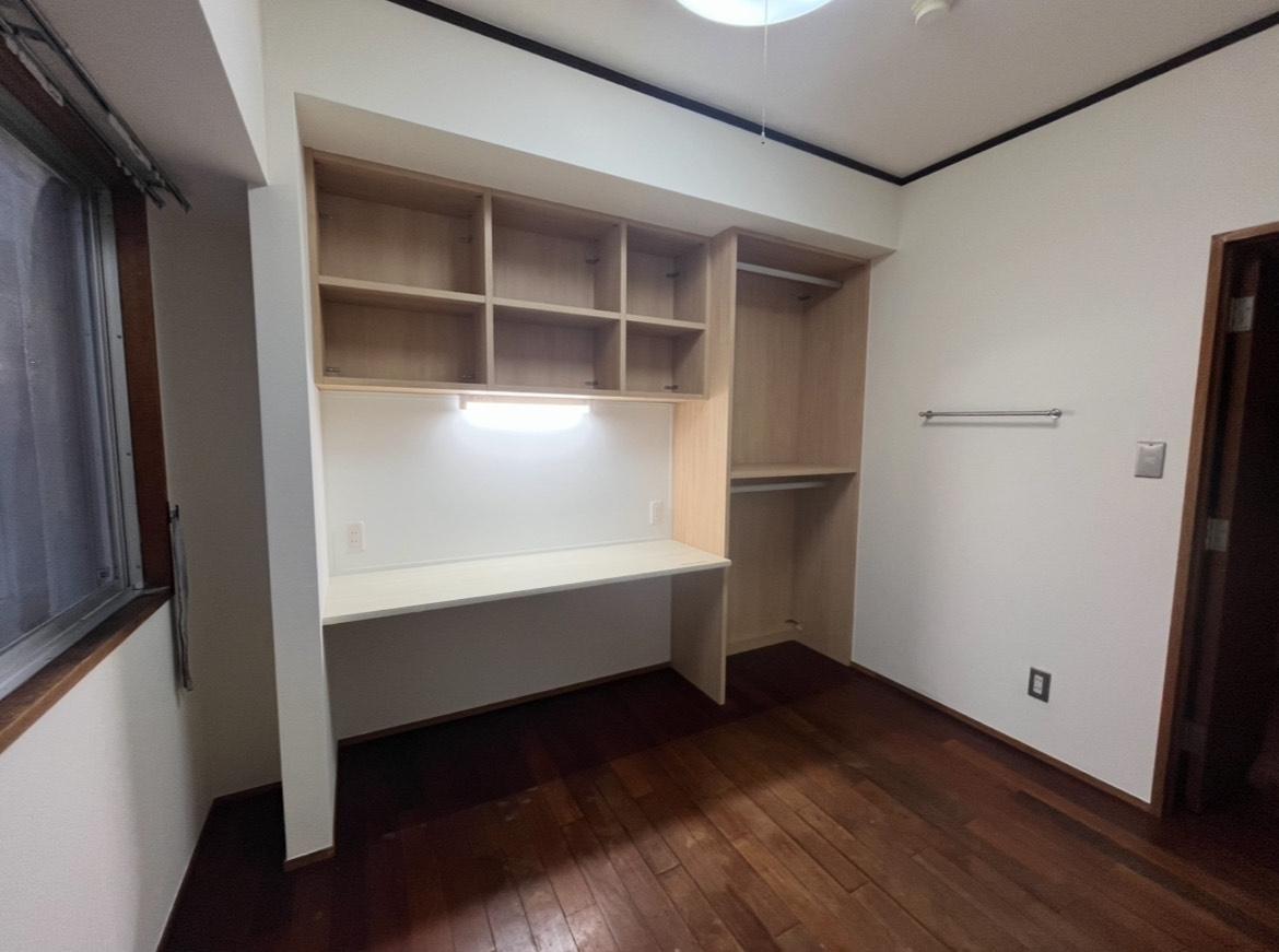 大きなクローゼットを解体し、同じ場所にオープンクローゼットとデスクを設置しました。部屋も広く感じらようになりました。