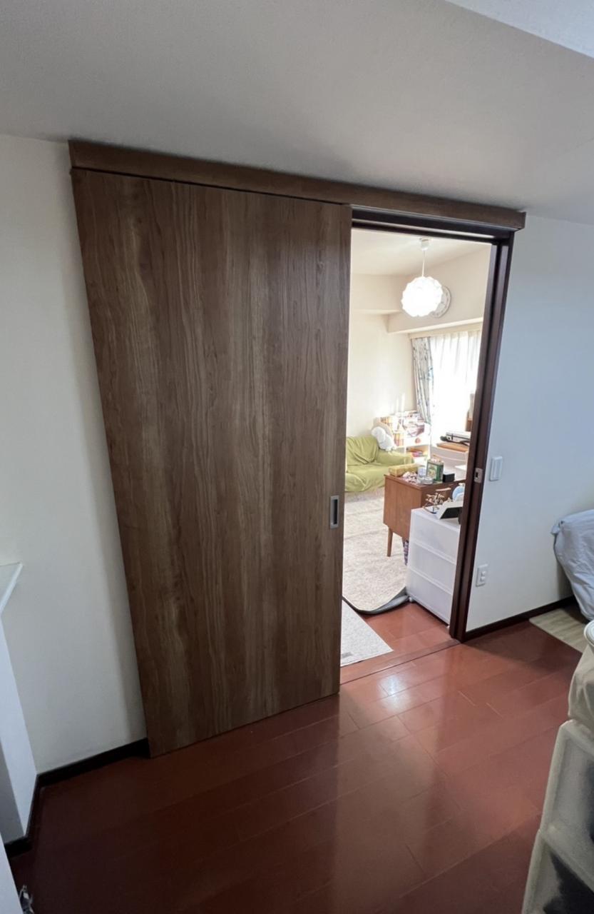 元々片開き戸(ドア)をアウトセット引戸に変更しました。取り付けられる環境さえあれば、簡単に引戸に変更することができ、部屋を有効的に使う事ができます。